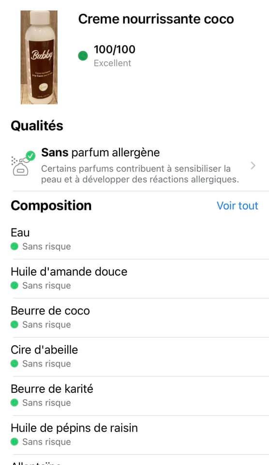 ingrédients :aqua, prunus amygdalus dulcis (sweet almond) oil, cocos nucifera (coconut) seed butter, cera alba (beeswax), butyrospermum parkii (shea) butter, vitis vinifera (grape) seed oil, allantoin, retinol, tocopherol, plantago major (broadleaf plantain) extract, matricaria recutita (chammile) extract, cocos nucifera (coconut) extract, tocopherol, cetearyl olivate, sorbitan olivate, lactobacillus ferment, coconut flavor